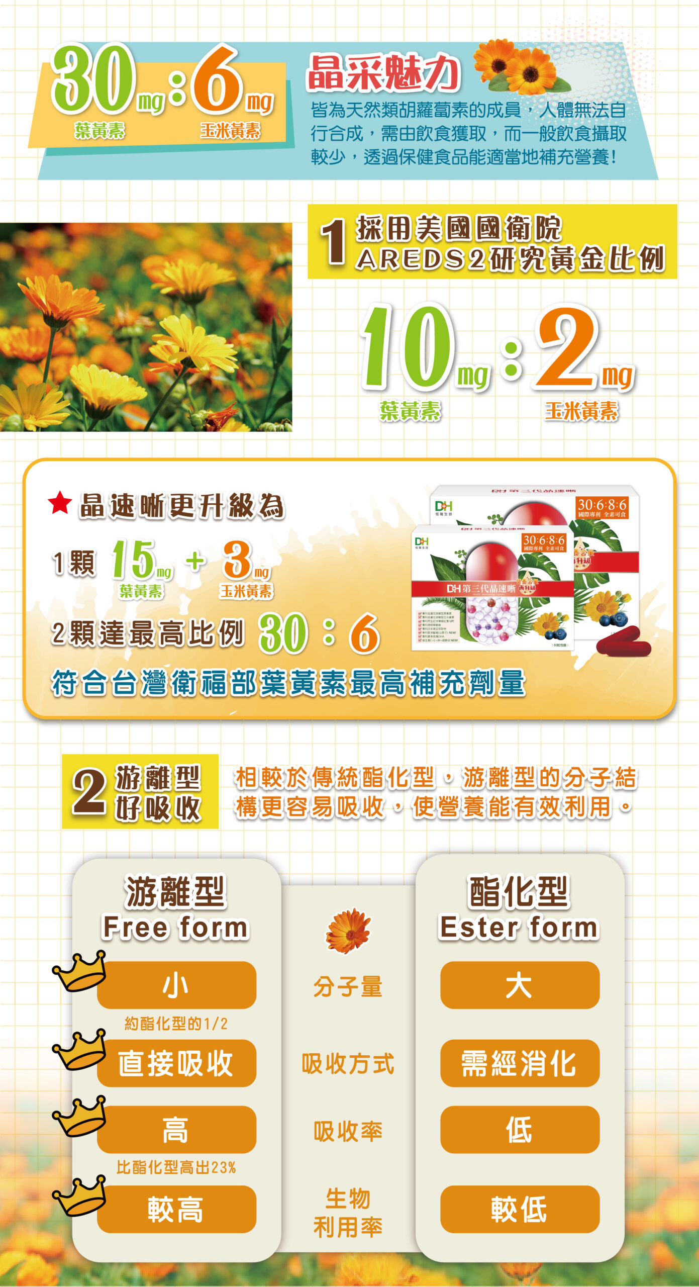 第三代晶速晰除了葉黃素:玉米黃素=30:6 黃金比例足量添加,更將蝦紅素添加到一日最高劑量8毫克,搭配6毫克95%高純度透明質酸鈉等複方成分,幫助調節生理機能,是晶亮調節的好幫手。