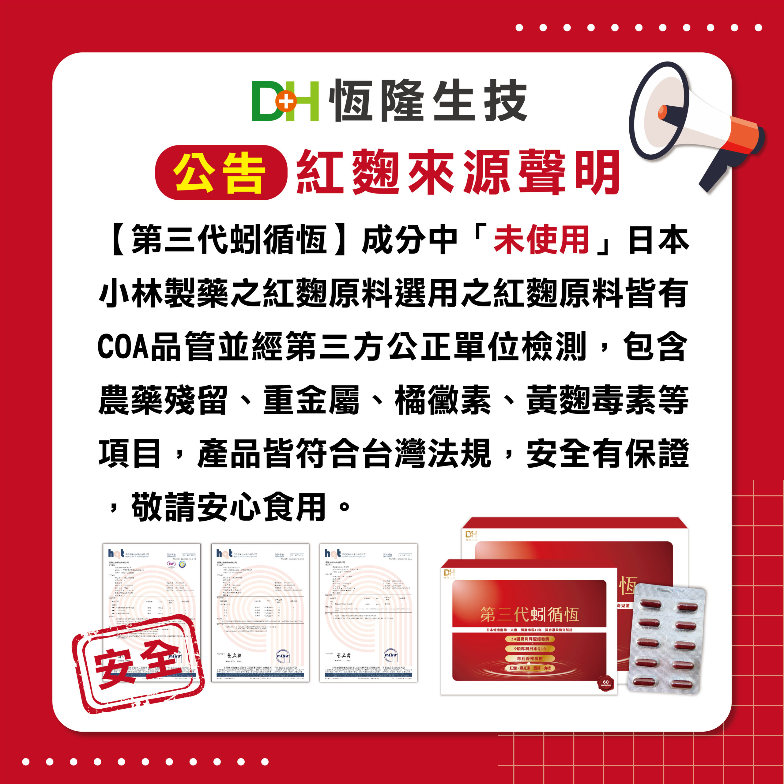 「DH恆隆生技」致力於提供消費者高品質、最安心、最優質的產品,我們想要給予大家一份安心。 「DH第三代蚓循恆」選用之紅麴原料皆有COA品管的優質紅麴。