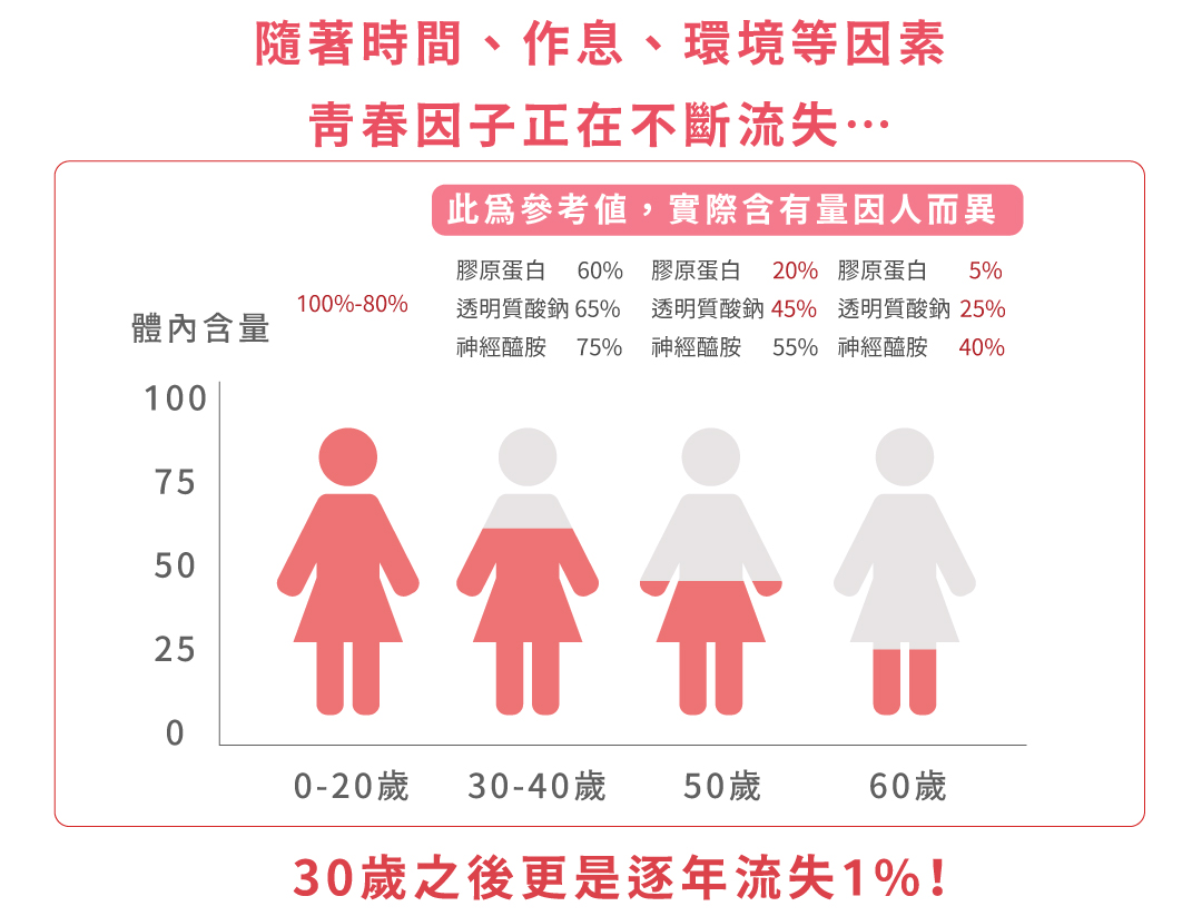 1.年紀漸增,膠原蛋白急遽流失、吸收合成效率下降
