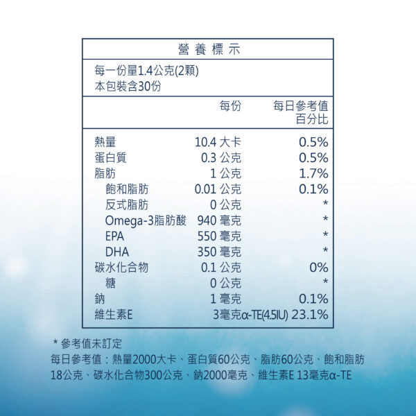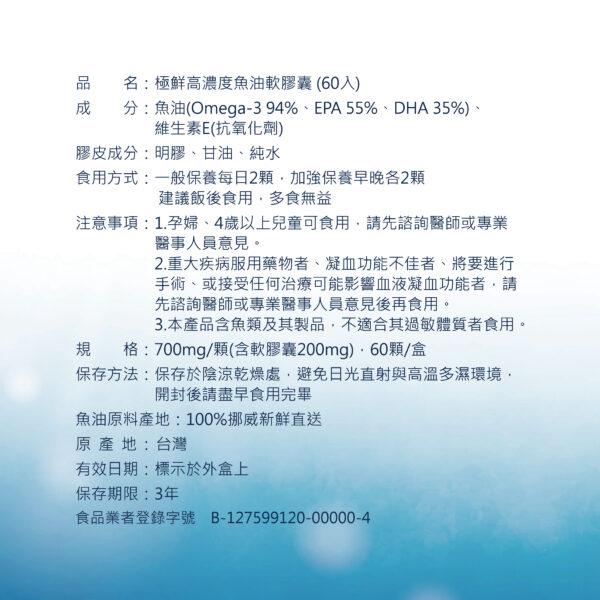 衛福部建議每日攝取量上限為2000mg,相當於極鮮高濃度魚油4顆(500mg/顆)